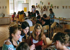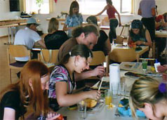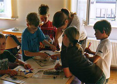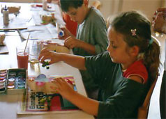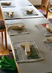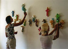 Konzept/Ablauf: Zuerst hing der Künstler in Form einer durchgehenden Linie eigene Arbeiten in den Räumen sanctclaras. Am 19., 20. und 21. Juni fanden in den Räumen dieser Präsentation insgesamt sieben Workshops statt; sechs für Kinder und Jugendliche und einer für Erwachsene. Beteiligt waren mehrere Schulen mit ihren Klassen-, Kunst- und Religionslehrern. Auch Eltern haben sich beteiligt. Die Arbeitsergebnisse wurden während des Trocknens besprochen und Texte dazu geschrieben. Unmittelbar danach wurden sie in die Ausstellung integriert, mit Schildchen versehen, die inzwischen im sanctclara - Büro erstellt wurden. |